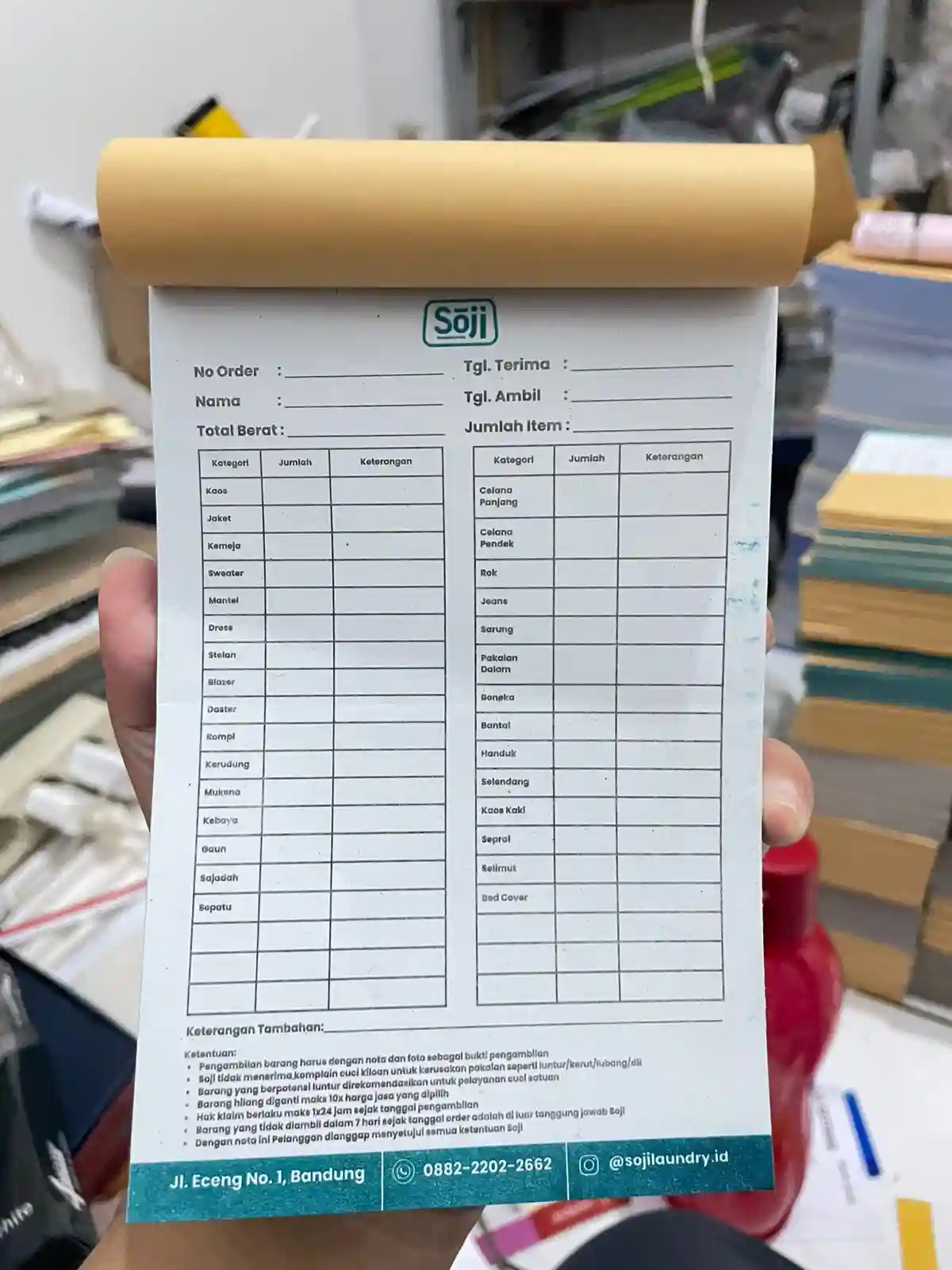 - Jenis Kertas: NCR (Non Carbon Required), tersedia 2 atau 3 rangkap