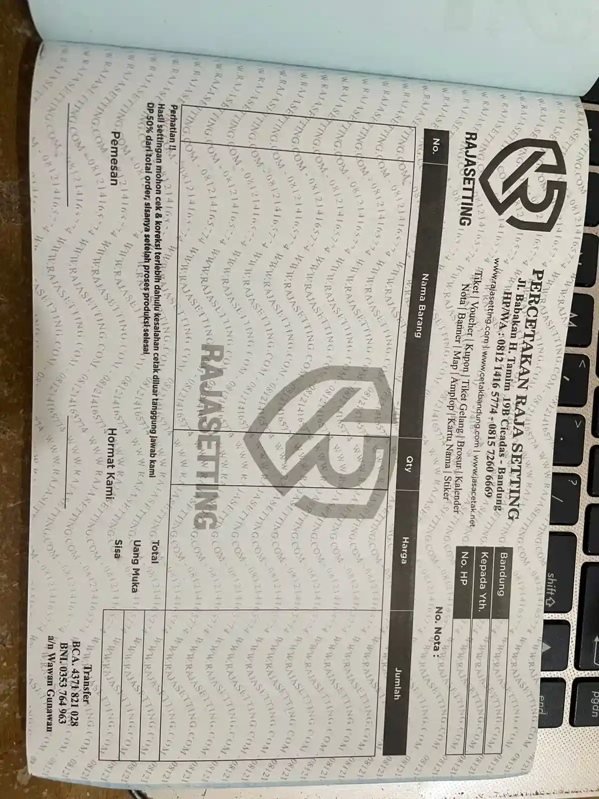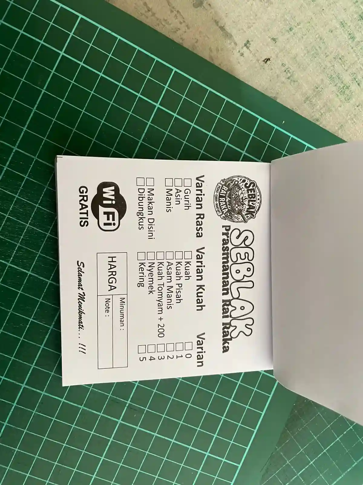 Kami menyediakan layanan cetak nota dengan kualitas terbaik, hasil cetakan tajam, serta finishing jilid lem pres yang kuat dan tahan lama. Anda juga dapat menambahkan nomor seri untuk mempermudah pengelolaan dan pencatatan transaksi.